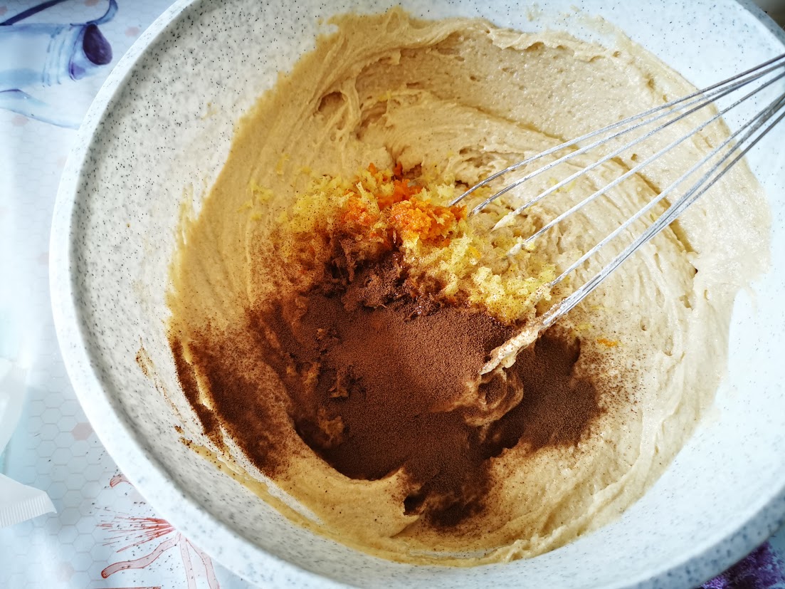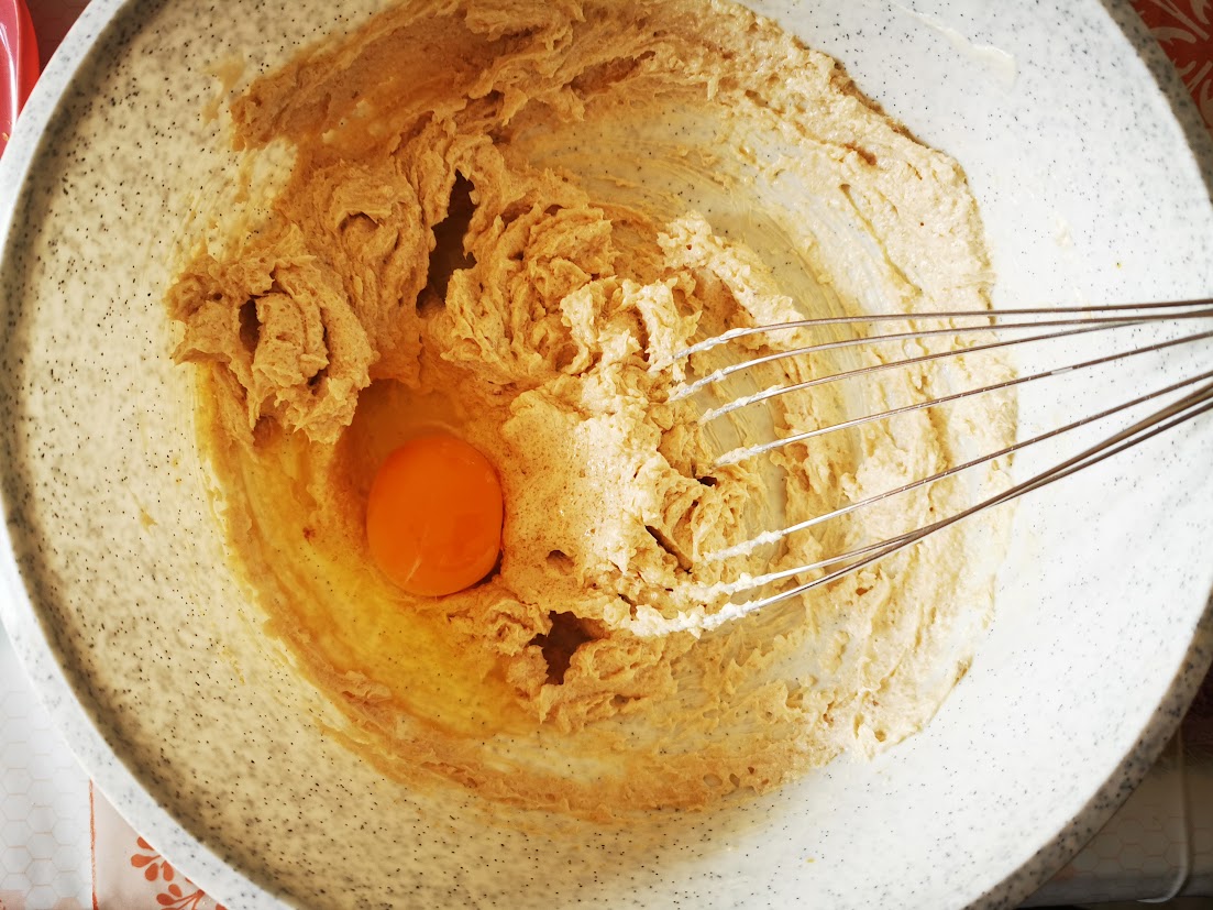Iniziamo a lavorare la margarina con lo zucchero integrale di canna, aiutandoci con la frusta a mano. Otterremo un bel composto cremoso. Aggiungiamo poi l’uovo (mi raccomando è molto importante che sia a temperatura ambiente), mescoliamo bene con la frusta. Setacciare la farina e il lievito con un colino a maglie molto strette per evitare grumi. Aggiungerla a composto e mescolare per bene con la frusta.