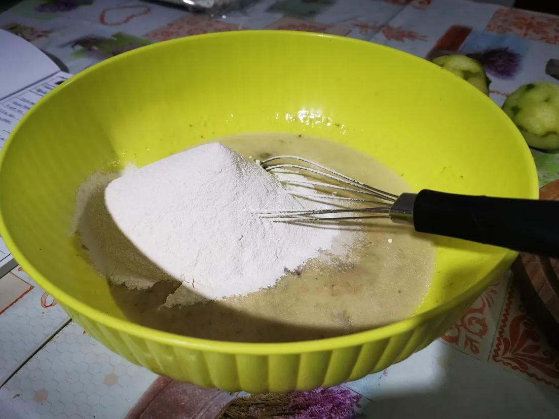 - Mescola bene farina e lievito setacciati, poi aggiungi un pizzico di sale.